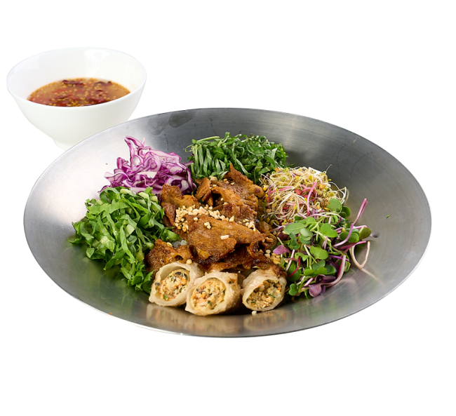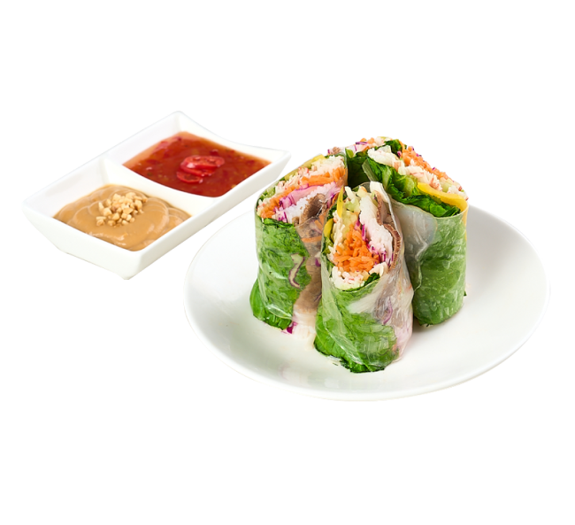 신선한 야채와 고기를 라이스페이퍼에 말아서 늑맘소스에 찍어먹는 롤